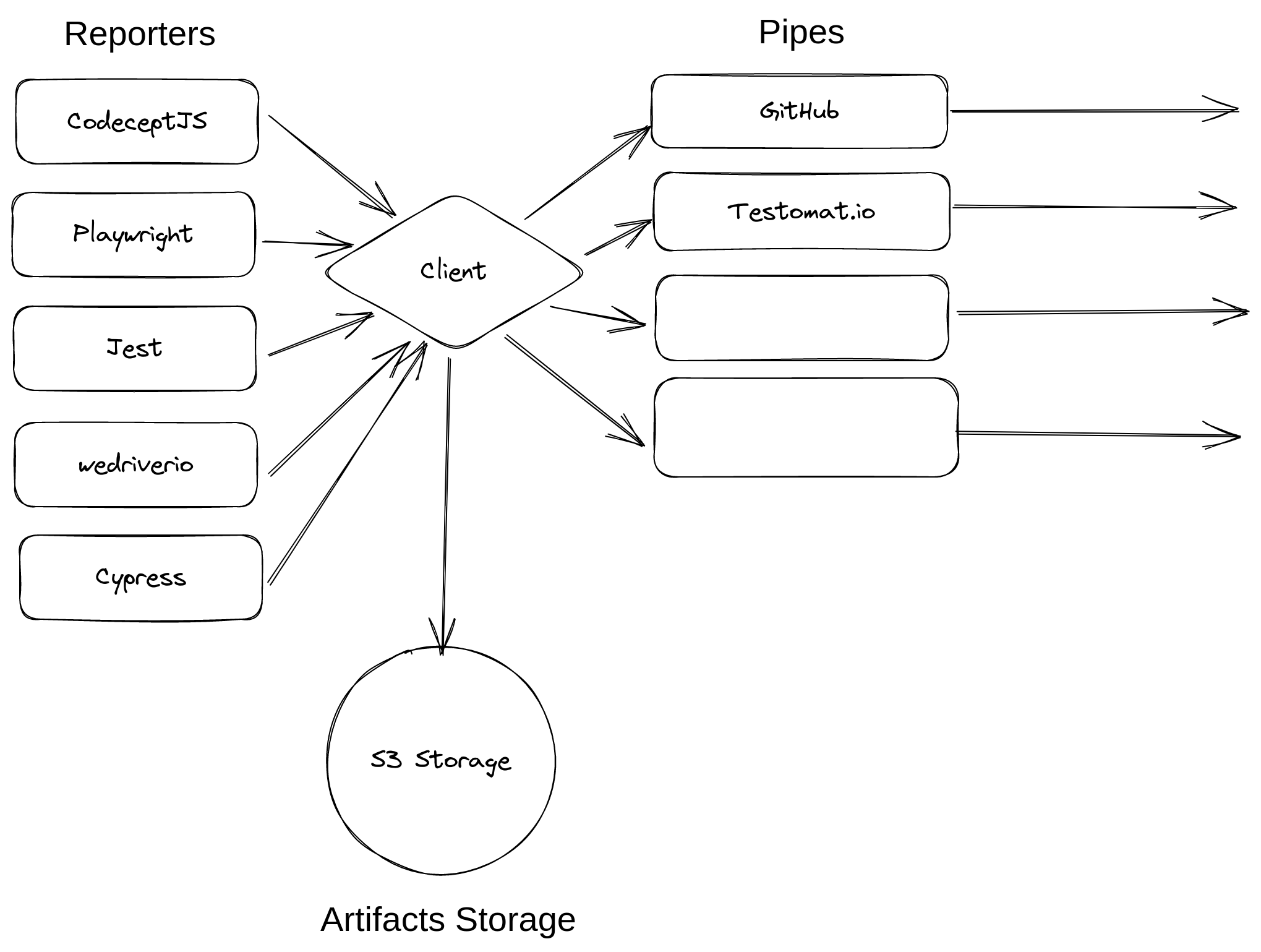 Section titled “What are Pipes?”Unlike other reporters, Testomat.io Reporter doesn’t force you to report data only to Testomat.io application. Testomat.io Reporter collects data from test frameworks and submits it via pipes to other services.